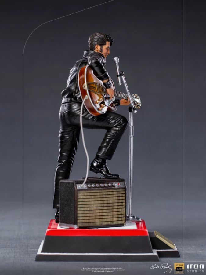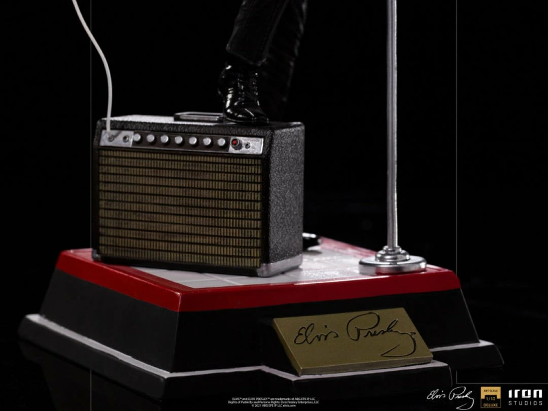 On a red and white base, which reproduces part of the real stage of his show, and with his signature on the front, he poses with his right leg on his “Benson 200” amplifier, supporting his semi-acoustic guitar “Gibson Super 400 CES 1963 “. The statue also has a microphone stand with a peculiar round base in front of it. In this way, Iron Studios proudly presents its “Elvis Presley Comeback Deluxe Art Scale 1/10 – Iron Studios” statue, replicating the legendary King of Rock in one of his most acclaimed performances, also the first figure derived from the pop music universe produced by Iron Studios.