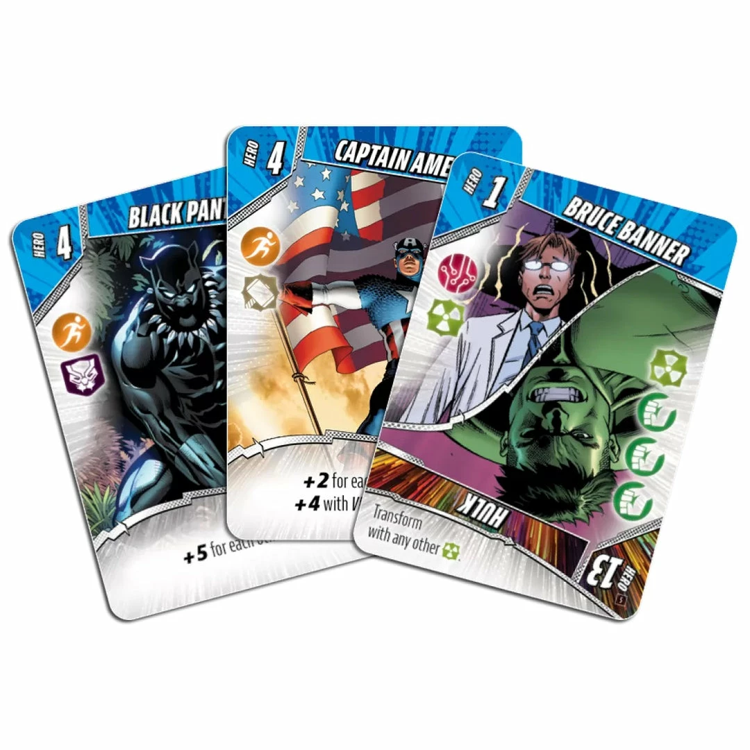 Players are dealt a hand of seven cards representing characters, items, or places from throughout the Marvel Universe. Each turn, you’ll draw from the Hero deck, the Villain deck, or the cards discarded by your opponents, before discarding a card yourself. Cards have a base value, and a bonus that changes based on the other cards in your hand. Whoever has the hand worth the most points at the end of the game is the winner!