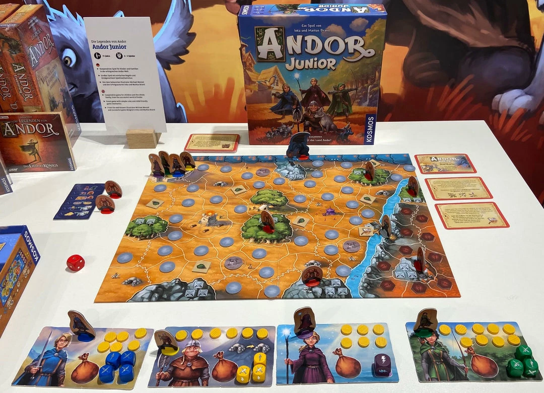 In Andor Junior, each player chooses one of four heroes Magician, Warrior, Archer, or Dwarf, before beginning their quest to rescue the wolf cubs lost in the dwarven mine. However, before beginning the search for the wolf cubs, the heroes must first complete the tasks given to them by Mart, the old bridge guard. Only after you have solved all of the bridge guard’s tasks will he let you cross the bridge to the dwarven mines where you believe the wolf cubs are hiding. But watch out! While you are on your way, the sly dragon is getting closer to the castle Rietburg. Should he arrive at the castle before the heroes have completed their tasks and saved the wolf cubs, then all is lost, and you lose the game. If you find all the wolf cubs before the dragon reaches Reitburg, you have won the game!
