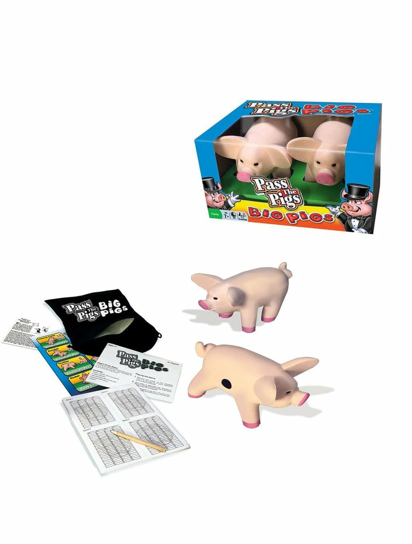 Contents: 2 over sized foam pig dice, 1 over sized score pad, 1 drawstring pig storage pouch, 1 pencil, illustrated instructions and Pass The Pigs history.