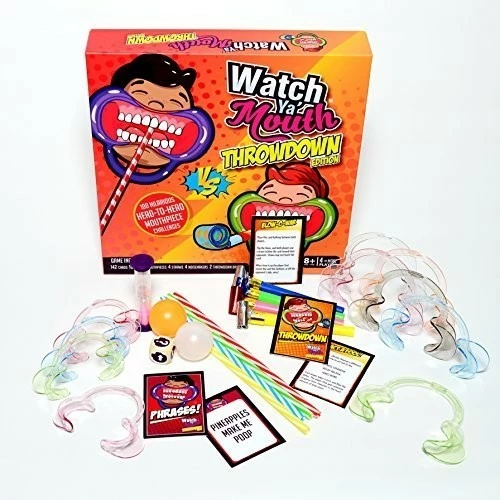 Watch Ya’ Mouth Throwdown Edition amps up mouthguard gameplay more notches than you and your friends’ belts combined. Our head-to-head mouthpiece THROWDOWNS (challenges) are lit and legit. Throwdown Edition fuses the signature silliness of the original Watch Ya’ Mouth Game with spanking-new, side-splitting tasks and surprises.